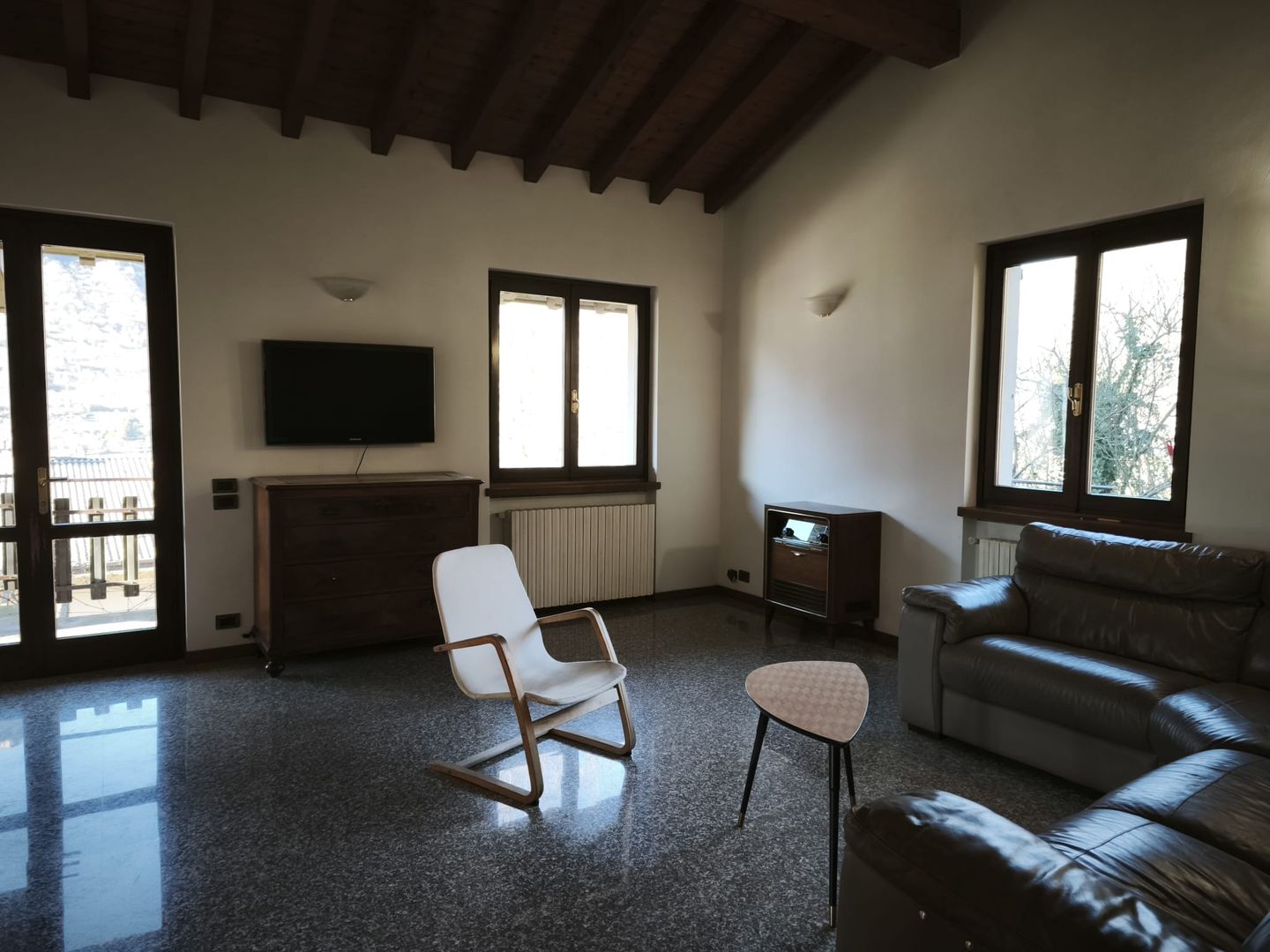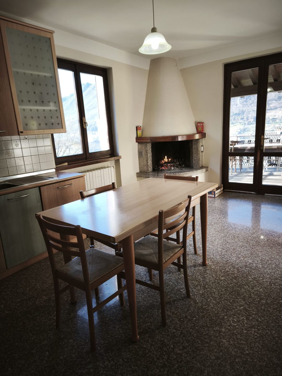 Einrichtung: Wohn/ Essküche: Offener Kamin sorgt an kühlen Tagen für wohlige Wäme. Großer Esstisch Personen. Ausgang auf die gedeckte sehr große Terrasse mit Sitzmöbeln. Gemütliche Sitzgruppe mit Ledersofa und Sessel. TV. In der Küchenzeile finden Sie einen Gas-Herd mit 4 Flammen, Backofen, Esspressomaschine, Spülmaschine. Schlafzimmer mit Doppelbett und Ausgang auf den Balkon mit Seeblick. Schlafzimmer mit 2 Einzelbetten. Badezimmer mit Wanne mit Duschvorrichtung, WC, Bidet, Waschbecken, Fenster.